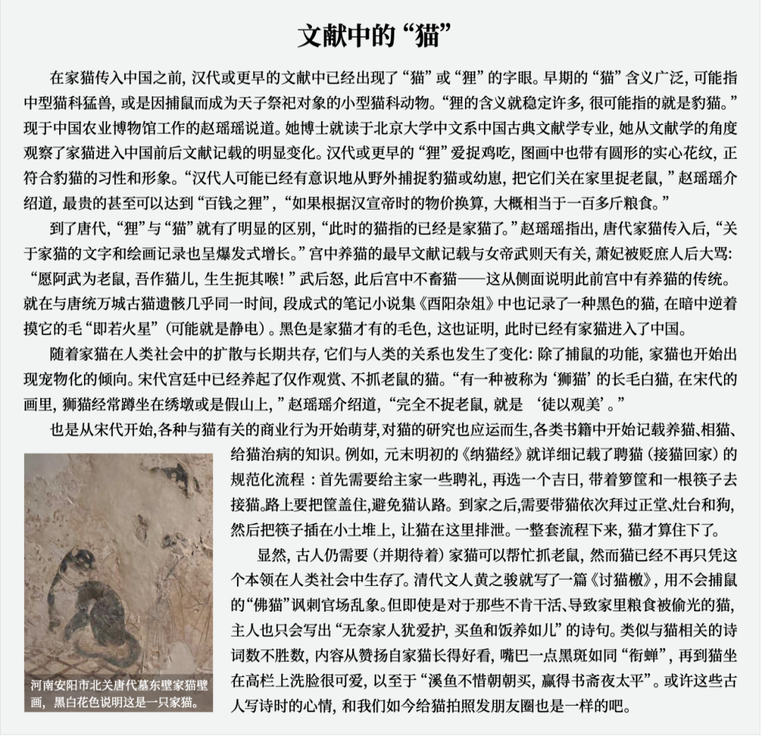 2021年,如今在北京大学生命科学学院从事人类和动物古基因组学研究的遇赫研究员和合作者在《科学·进展》(Science Advances)发表了一项研究,补充了来自中国家猫的证据。她走遍中国,采集了来自23个地点的208只家猫,还有三十余只亚洲野猫和荒漠猫的样品。最终,中国家猫的基因组数据显示,它们和全球其他地区的家猫一样,也起源于非洲野猫。