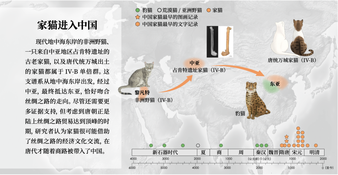 在公元706年到公元883年,生活在唐代统万城的古猫就属于IV-B单倍群。而在相同时期,一只来自公元775年到公元940年中亚地区占肯特遗址(Dhzankent,今属哈萨克斯坦)的古老家猫同样属于IV-B单倍群。现代生活在地中海东岸的非洲野猫也属于IV-B单倍群。核基因组的分析也给出了类似的结果:与中亚这只古代家猫遗传距离最近的是唐统万城的家猫,之后才是中国东部时代更晚的家猫。