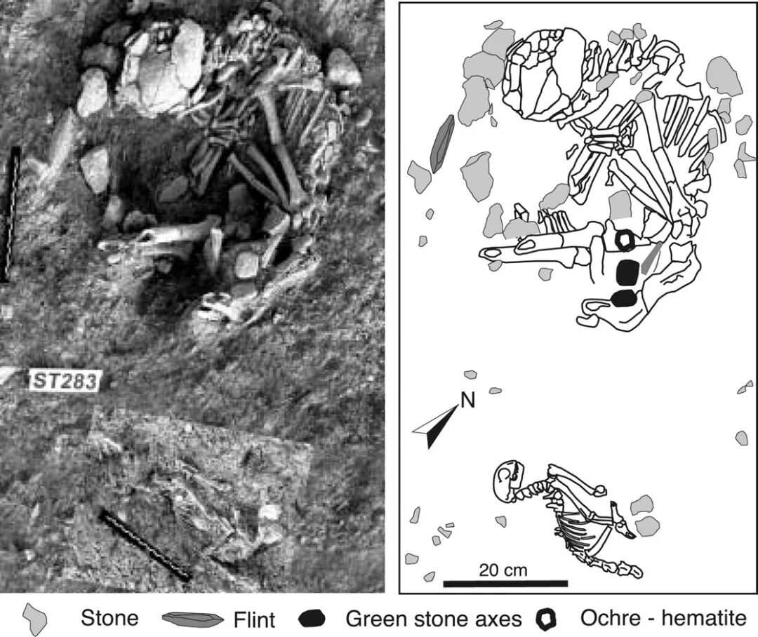 塞浦路斯遗址中发现人类(上面的骨架)和猫(下面的骨架)合葬。我们和猫猫的友谊已经近万年了 | Seiffert et al., 2020